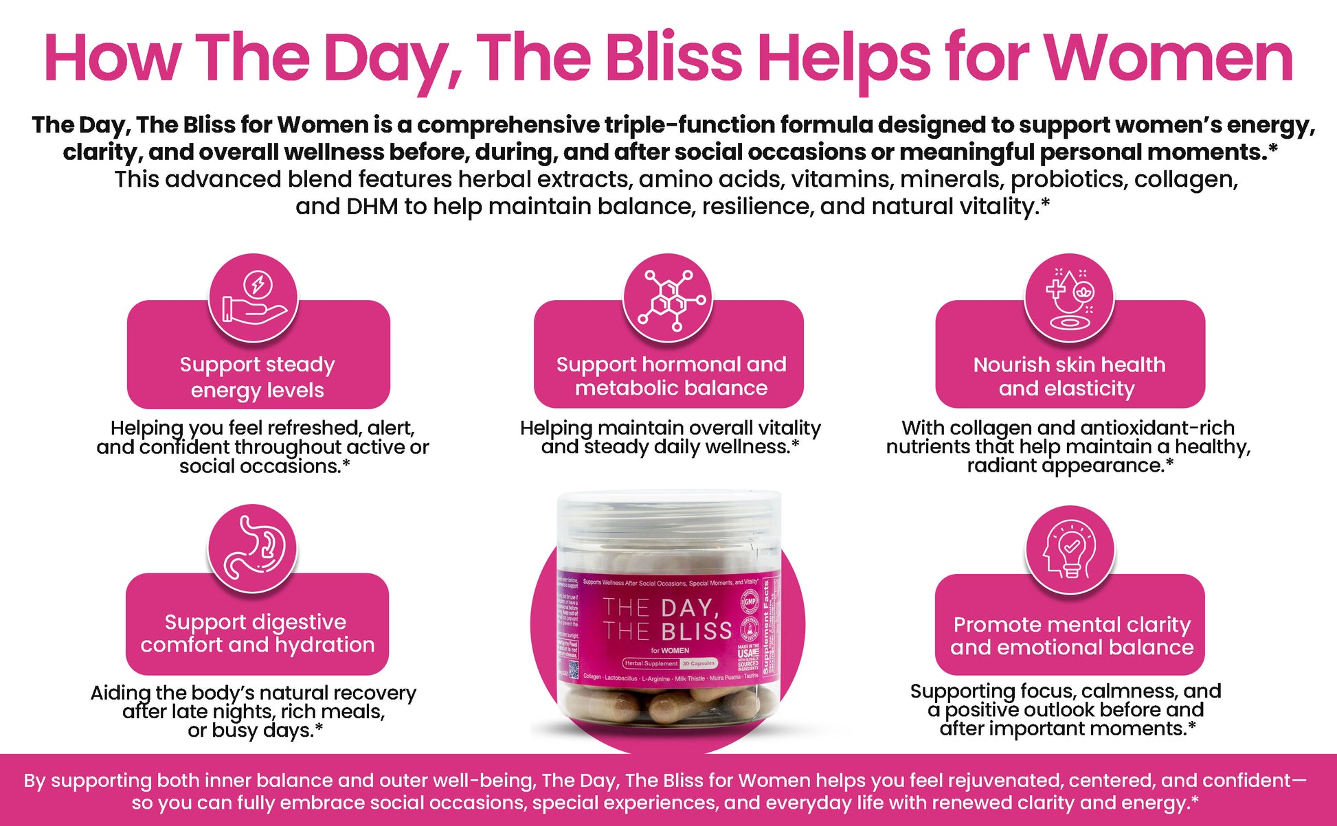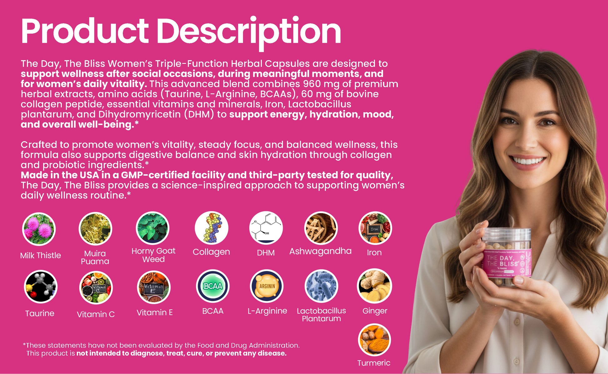 The Day, The Bliss Women’s Triple-Function Herbal Capsules are designed to support wellness after social occasions, during meaningful moments, and for women’s daily vitality. This advanced blend combines 960 mg of premium herbal extracts, amino acids (Taurine, L-Arginine, BCAAs), 60 mg of bovine collagen peptide, essential vitamins and minerals, Iron, Lactobacillus plantarum, and Dihydromyricetin (DHM) to support energy, hydration, mood, and overall well-being.